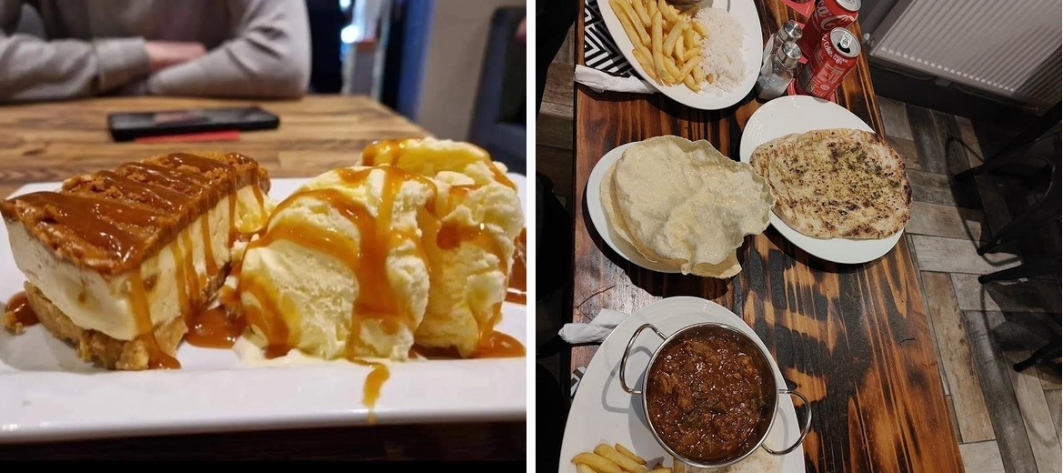 The menu features a wide selection, from hearty main courses like cheeseburgers and sausage with mash to delicious desserts like Biscoff cheesecake and sticky toffee pudding.